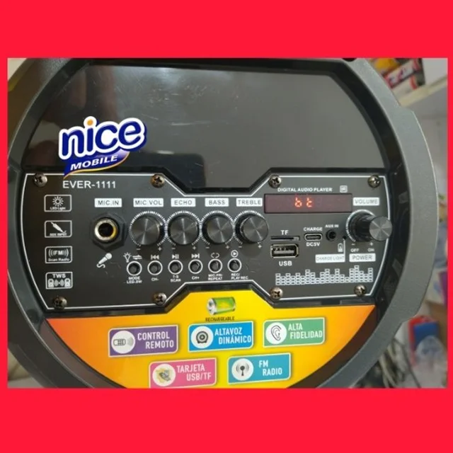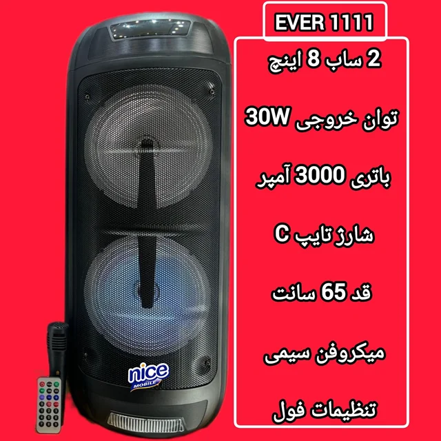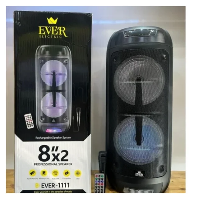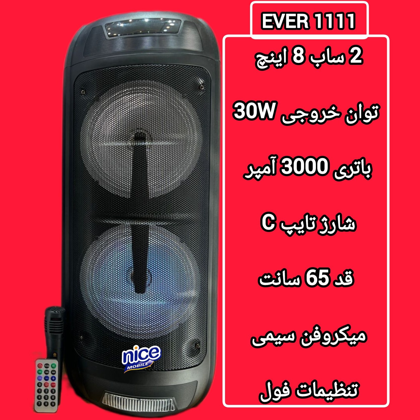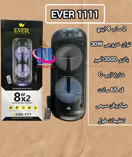 اسپیکر بلوتوثی قابل حمل اِوِر مدل EVER-1111 یک انتخاب خوب برای کسانی هست که به کیفیت و بیس صدا اهمیت می دهند.این اسپیکر برای فضای باز انتخاب خوبی می باشد چون داری صدای قوی می باشد این اسپیر داری رقص نور می باشد و یکی از نکات جالب رقص نور آن هماهنگ بودن با آهنگ می باشد بر روی پنل دکمه های متفاوتی وجود دارد مثله دکمه تنظیم صدای اصلی ،و دو دکمه مربوط به تنظیم اکو و بلندی صدای میکروفون داری کنترل و میکروفون می باشد